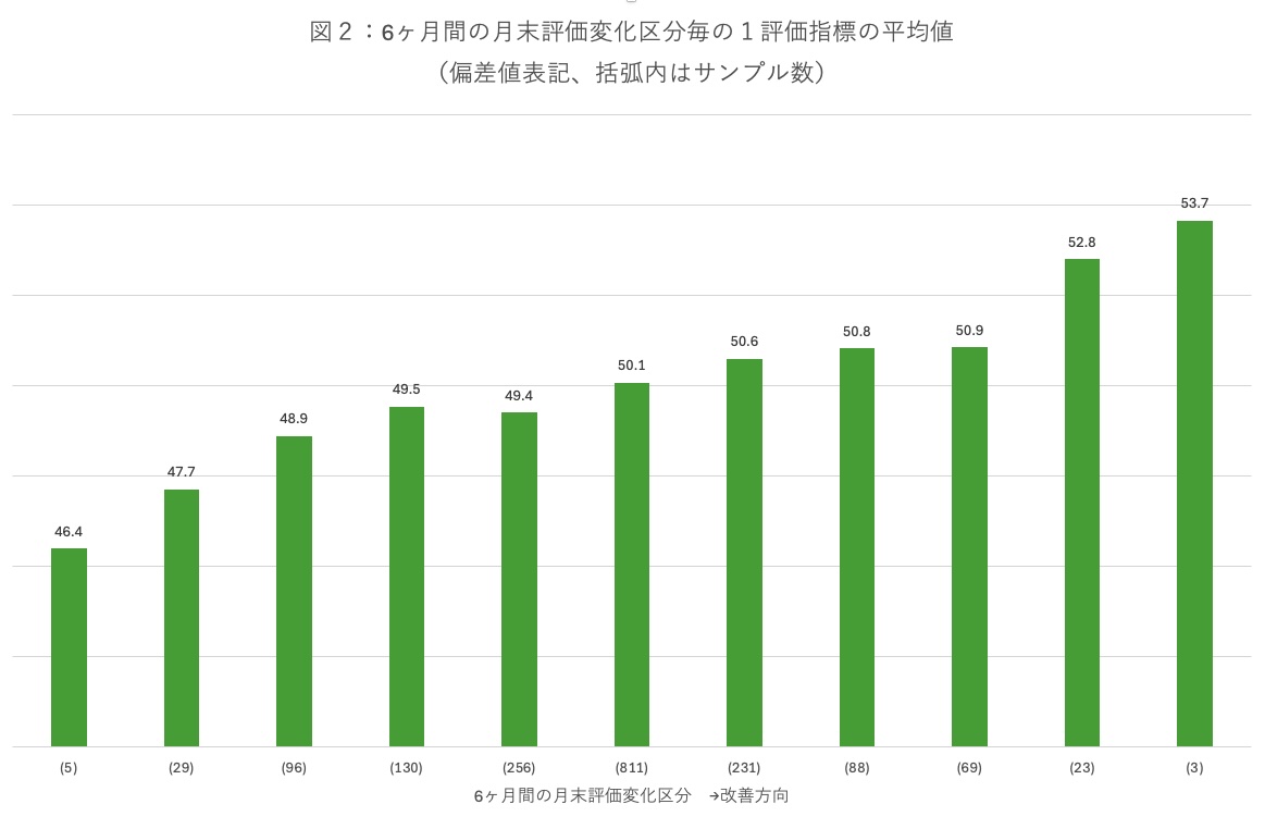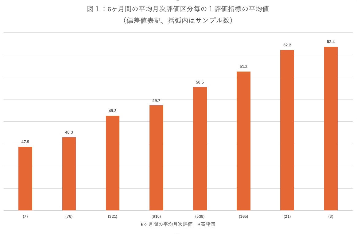 図1は、月次評価に基づく区分ごとに、ある評価指標(複数あるうちの一つ)の平均偏差値を棒グラフで示したものです。評価区分は過去6ヶ月間の月次評価の平均値により決定しており、横軸が右に行くほど高い評価区分となります。棒グラフは右肩上がりの傾向を示しており、月次評価の高さと評価指標の正の関係を表しています。グラフ下部の括弧内の数値は、各区分に含まれるサンプル数を示しています。