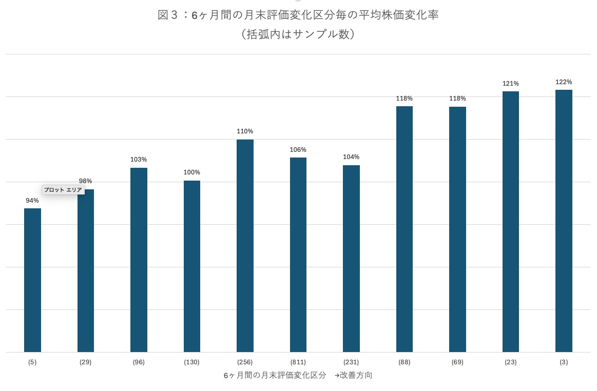 次に図3をご覧ください。ここでは、図2と同様に月末評価の改善幅に基づく区分ごとに、6ヶ月間の株価変化率の平均を棒グラフで表示しています(前回ブログの図3を右側面から見た構図となります)。途中やや波打ちながらも、全体として右肩上がりの傾向を示しており、月末評価が大きく改善した企業ほど、株価も上昇する傾向があったことを示しています。グラフ中の「100%」は株価が変動しなかったことを意味します。