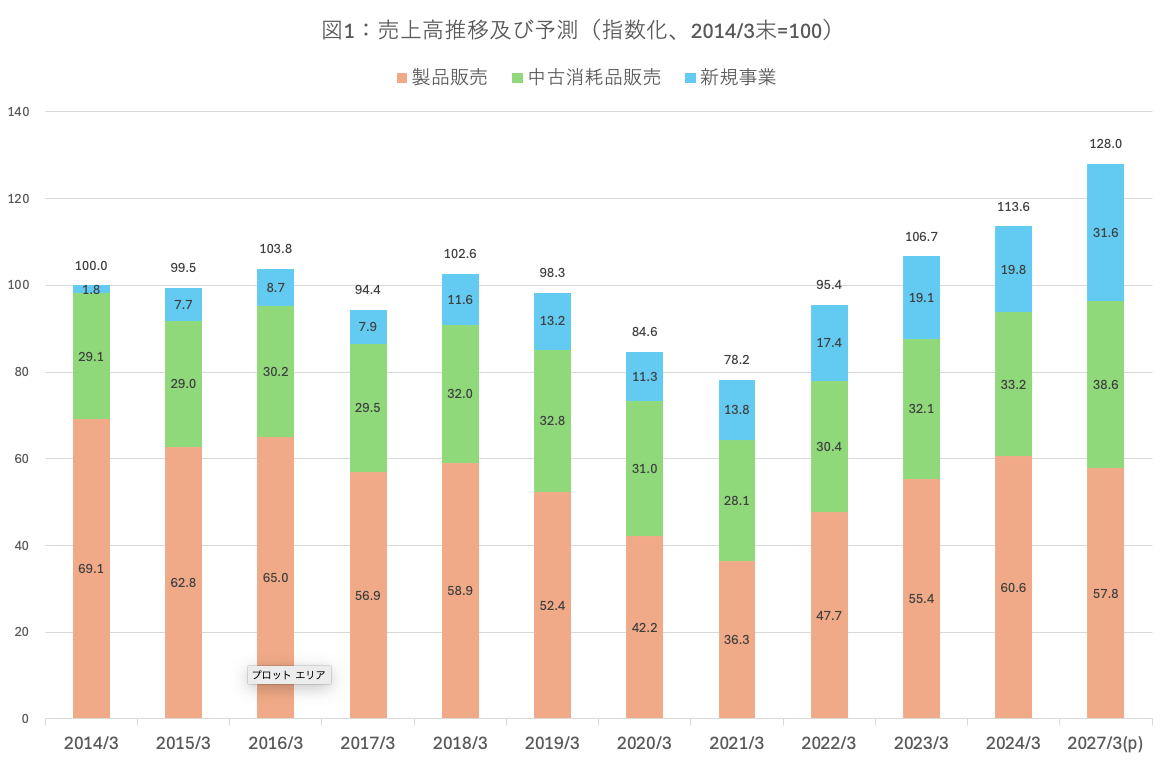 同社の2014年3月期以降の売上高推移を図1に示します。2027年3月期に目標とする売上高も公表されて、右肩上がりのグラフとなっていますが、