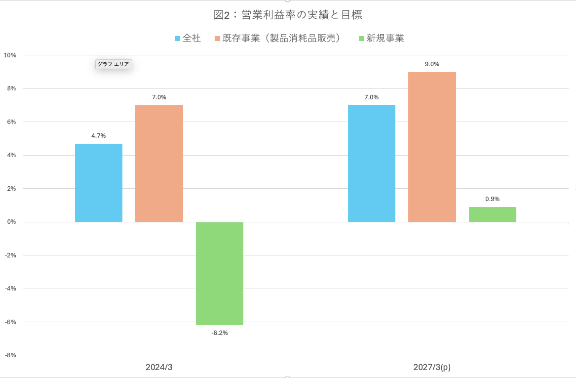当日の説明は中期経営計画に基づく、経営改善を通じた業績向上をアピールする内容でした。大筋としては、既存事業分野での営業利益率の向上と、新規事業分野での収益拡大により2027年3月末には、営業利益率で7%以上、ROEで6%以上を達成し、その後2030年3月期にはROE10%以上を目指す、という事です。製造業企業らしい手堅い計画の様に思われましたが、その内訳を見ると投資家が飛びつく様な内容では無い事が分かります。