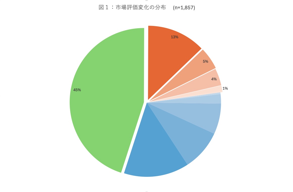 これまでと同じデータセットを用いて、過去6ヶ月間における当手法の市場評価尺度に基づき、評価改善の状況を分析しました(図1)。その結果、評価が向上した企業の割合はオレンジ色の領域が示す23%、変化がなかった企業は緑色の領域が示す45%、評価が下落した企業は青色の領域が示す32%という結果でした。つまり、約7割以上の企業で市場評価が改善されておらず、IR活動に取り組むも不満の残る結果となっている事が伺えます。
