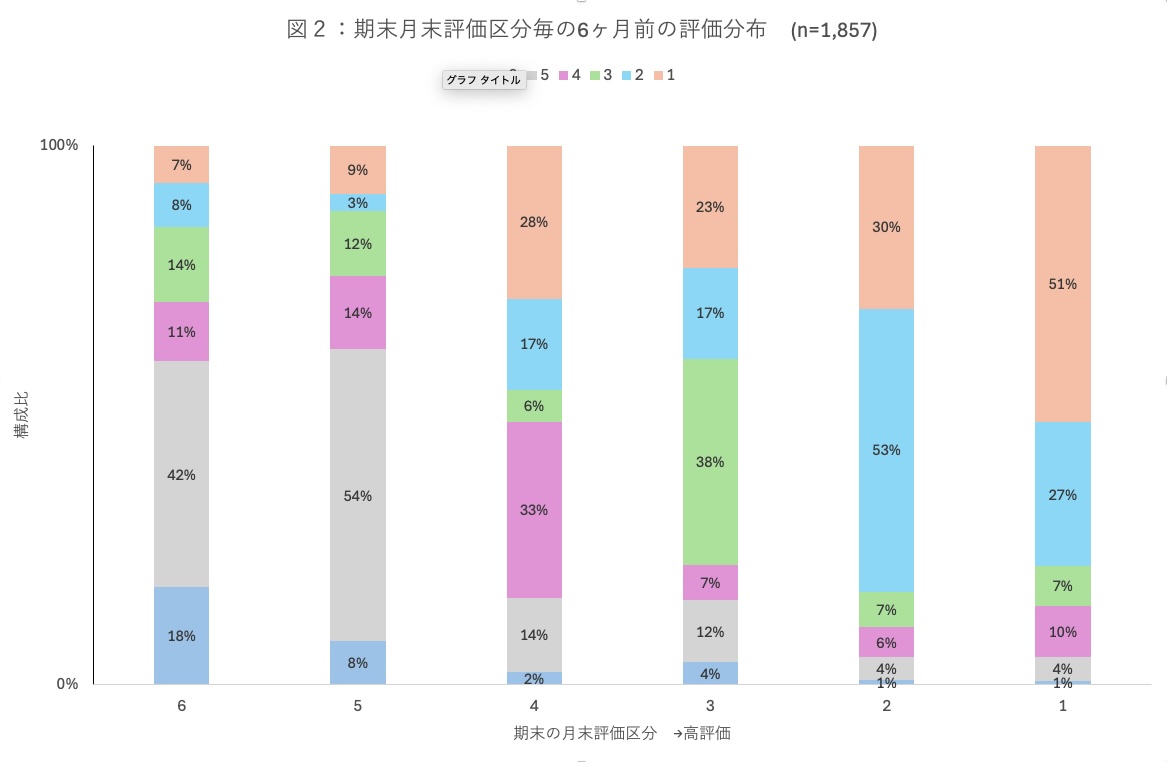 次に、6ヶ月間の評価の変遷を詳しく見るため、期末時点の評価区分(1が最高、6が最低)ごとに、期初時点での評価構成を示したものが図2です。例えば期末評価が1の区分では、その51%の企業が6ヶ月前も評価1だった事を表します。