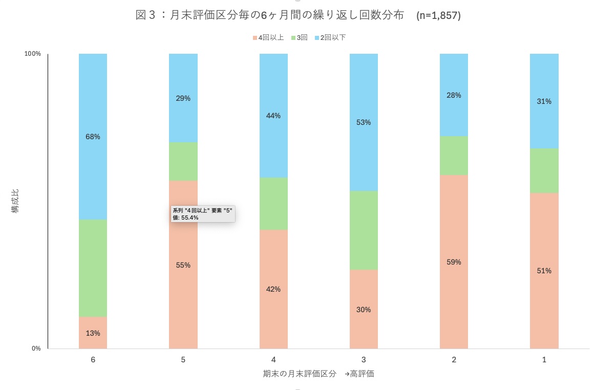 さらに、評価の定着度を示すために、6ヶ月間で同じ評価が何回繰り返されたかを図3に示しました。繰り返し回数を3区分し、期末の評価区分毎に構成比を示しています。例えば評価1の区分ではその51%の構成企業が評価1を4回以上得た事を表します。